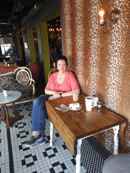 Almost as important, it has a really magical atmosphere. It’s in an old house, and as you can guess from the name it has a vaguely Gothic theme. It used to sell t shirts featuring Robert Smith of the Cure and the Witches Brew name I think, or at least there is one framed next to the toilets. Even the “bathroom” [there’s no bath in there though] is beautiful, always with incense burning. Seating and tables is creative and each little nook is randomly inspired. You get quite a lot of younger adults in there but also a whole range of ages. Again, it’s a place you could linger for hours (and take games if you want; not Twister perhaps – especially during covid – but certainly a card or small board game). When we went on Sunday, Marie chose a vegetarian burger and fries for us to try – really good, even though I might not tell my friends about eating a beet burger – and for dessert we had bundt cake to go (small, but packing a tasty punch) and I chose the three mini cannoli to eat in. Marie had her favourite, decadent Black Magic mint chocolate drink and myself a pot of hot Moulin Rouge tea which had cinnamon and smoked spices.