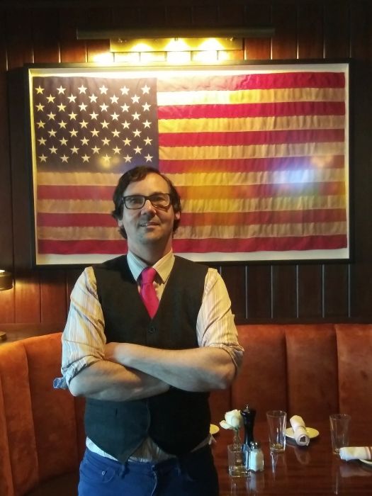 We didn’t know but they do an excellent $20 lunch special, and we all went for that! Marie French onion soup and crispy chicken (glass of water to drink). The rest of us had rose wine, a campari and myself the same Kentucky beer aged in a whiskey barrel that I’d had when Marie and I last came here, with friends. And to finish, amazing hot molten chocolate cake with vanilla ice cream. Marie took a photo of me under the flag, and the waiting staff congratulated me!