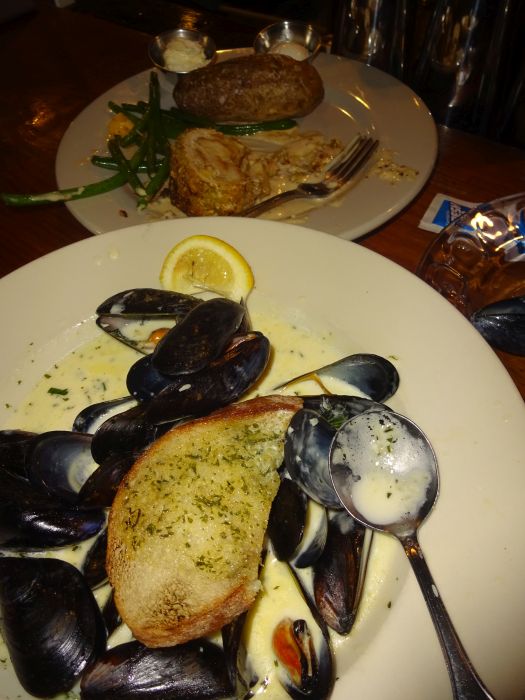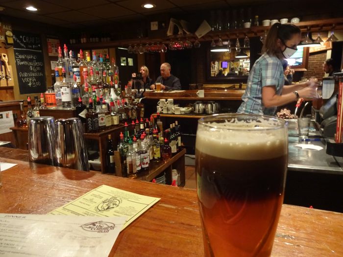 We liked the village very much, the guest house, everything. In the evening we headed on a walk down the road to the small Main Street. Oh, by the way, you may well not get any cell (mobile) phone reception out here! Only if you have Verizon. We have T-Mobile. Nothing. We were pretty much okay with that, as we wanted to get away from modern life for a bit. In Ashland there are mainly just two restaurants in town of any note: a Mexican place a further walk away or The Common Man which is a small chain of pub-restaurants. You would never know the one in Ashland was part of a chain, and it felt totally unique (old tavern style). It was busy. The nice staff on the desk said they would call us if/when a table opened up. No problem. Oh, but wait! We have no phone we can use! We hung around a while though, and we were told there were now bar seats available upstairs. Happily we took those, and loved the whole experience for the next two hours or so. Great food, great cocktails and beer and great chat with the fast-moving and likeable barmaid (who had a dry sense of humour). We shared mussels and a kind of apple infused chicken kiev – both delicious. We lingered a long time.