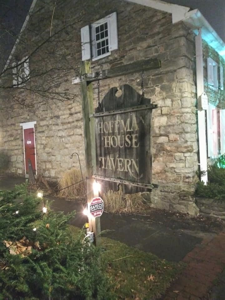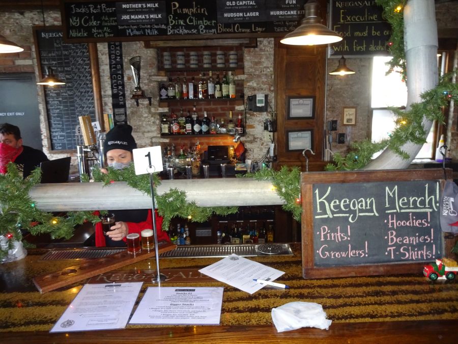 Next the hotel check in, just over the bridge, and time to shower etc. Marie later drove us to Hoffman House in Uptown Kingston for our dinner reservation. What a contrast Uptown Kingston is from Downtown right now! No disrespect to Downtown, and it’s probably suffering from Covid times (plus we didn’t see it at night, so who knows). But Uptown is gorgeous. Still very quiet, but a lot to do and consume (especially in the eventual post-covid). We walked around a bit, very impressed. Then to the Hoffman, which is a charming old place dating from 1711! Initially we were taken to a small room up a few steps. I never complain about anything – I’m British – but I’m very grateful that Marie complains on behalf of both of us. The room had no windows or Christmas lights, and was not the magical setting we’d hoped for. We said we’d rather wait for a better table. After about twenty minutes we were given a wonderful seating right by a Christmas tree and big old, roaring fireplace. It’s so justifiable to complain when it’s needed! It was a really special atmosphere and the food and drink was outstanding. Marie had a cosmo cocktail, and I a bourbon and blood orange ‘old-fashioned’. We shared a crab rangoon starter from the specials menu, and for mains Marie tried the St. John’s Waldorf chicken; encrusted in some of the ingredients from a Waldorf salad and gorgonzola and then served with polenta. I had the steak au poivre (creamy pepper gravy), with garlic mash. All so good, and we must have had the best part of two hours in there. Very nice waitress, who is mad about funky pens. She showed us her two…I think emu pens, with feather and lights.