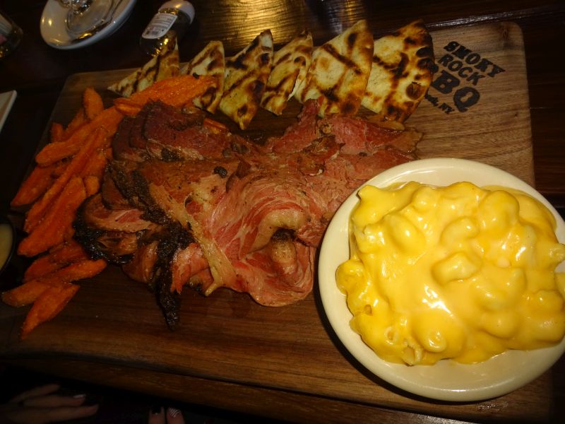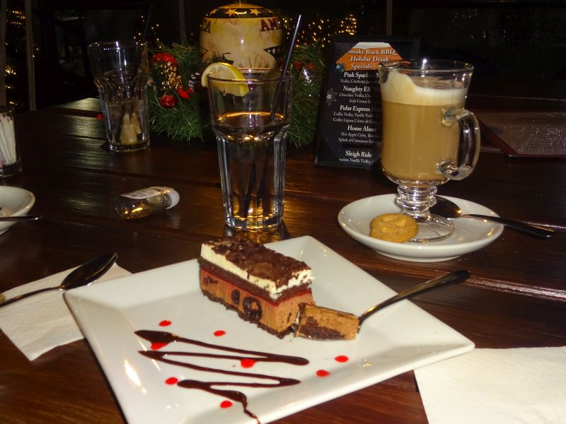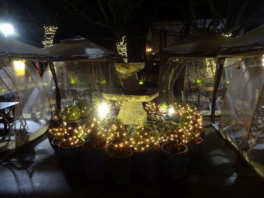 A stop back near the hotel at Hannafords and Dunkin, and then we finished the scones & cream in the room. For our last evening…what to do? Our thoughts were maybe to dine at one of the big, chain restaurants near us like Texas Roadhouse. But more interesting was the option of driving to Rhinebeck, and to Smoky Rock BBQ. Sleet had stopped, so driving over the bridge at night was fine. We went for the barbecue choice! A beautiful, Greek-owned place, they have an alternative kind of outdoor dining: bubbles! Lighting in the front garden is very atmospheric and romantic, with a lot of string lights. They put a small, portable heater inside the bubble. We felt it needs to be warmer though, but we braved it and had a fine evening sharing pastrami, mac and cheese and the most amazing, honeyed and large, crispy sweet potato fries and then followed by cappuccino and a Black Forest cake slice. The hot toddy was one of the best ever. Smoky Rock below…