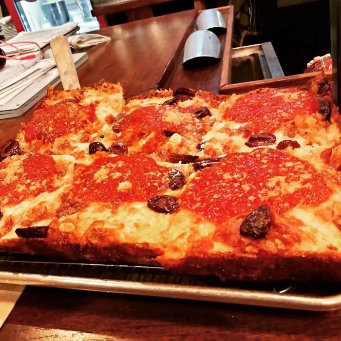 Above, Detroit style pizza at Donatina (deep pan, very crispy edges and base)
