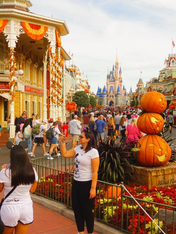 The free bus to Magic Kingdom, then when you enter the park the iconic view of Cinderella’s Castle is there right away, and the almost cake decoration perfect Main Street USA with loads of gift shops (and, usefully much later, a big Starbucks!). Disney always surprises you with a never-ending array of details often based on the famous cartoon characters. Mickey Mouse pumpkin street lanterns for one example, to be lit later.