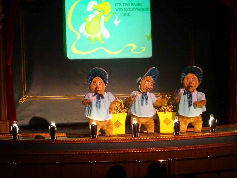 Alighting a bit later, we dropped in to another theatre at the last calls to watch the Country Bears Jamboree performance. It definitely helps to be high or tipsy for that! Our favourite bear was maybe the one singing ghastly, Halloween style songs and interrupting other performing bears!