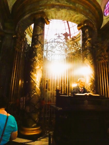 The lead through to the ride car was fun too. Parks usually make the most of the anticipation factor and to offer entertainment to stop the public from getting bored waiting, and there were holograms of strange H.P film characters sharing dialogue in a make-up of a ghostly London bank.