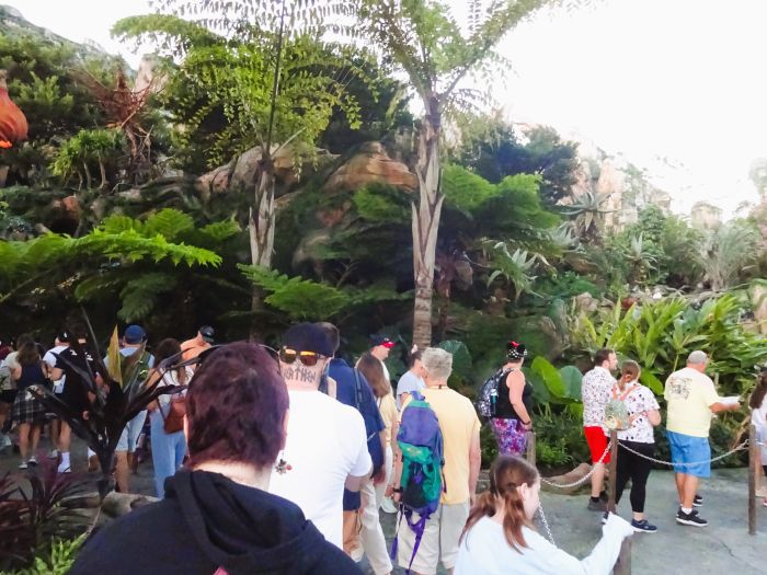 So we duly arrived early. Most people were legging it! We were very much looking forward to trying the ride – you can’t lightnin’ lane it as it’s so popular – but we generally never rush on anything. I think rushing is low class unless there’s an emergency or important reason. So we let many people pass us, and we enjoyed taking a quick look at one or two animals on the way. Then we got to Pandora, and joined the actual queue/line. The scenery of Pandora (the planet on which the film Avatar is set) is a brilliant piece of engineering. Really stunning, we weren’t sure what was natural and what was man made! The whole park so far felt like an upgrade on when we last went, just really beautiful and relaxing. The wait for the ride was about 30-40 minutes I think, but it went quickly.
