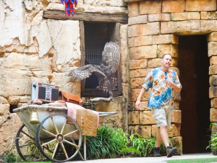 Then we walked through the now ever-crowded park to another nostalgic attraction of ours and very famous to Disney-ites: the Enchanted Tiki Room. There is also one at the original Disney park, Disneyland in California and that dates back to 1963. The one at Disneyworld in Florida was built in 1971. After queuing you enter a large round wicker tiki hut. There are fake tropical birds on perches above, and lots of other man-made décor around. All is very colourful and spotlit. The show – which lasts for about fifteen minutes – starts with the birds seemingly “coming to life” and starting a comical conversation between themselves. The birds represent different nationalities so the accents are strong. I think Fritz starts off proceedings. Then they break into song, the famous ‘Tiki Room’ number. Then the singing flowers have their turn, and the drumming alligators join in and so on. My brother, Martyn, would roll his eyes and exit to the nearest place to get a beer within seventeen seconds, but we like it!