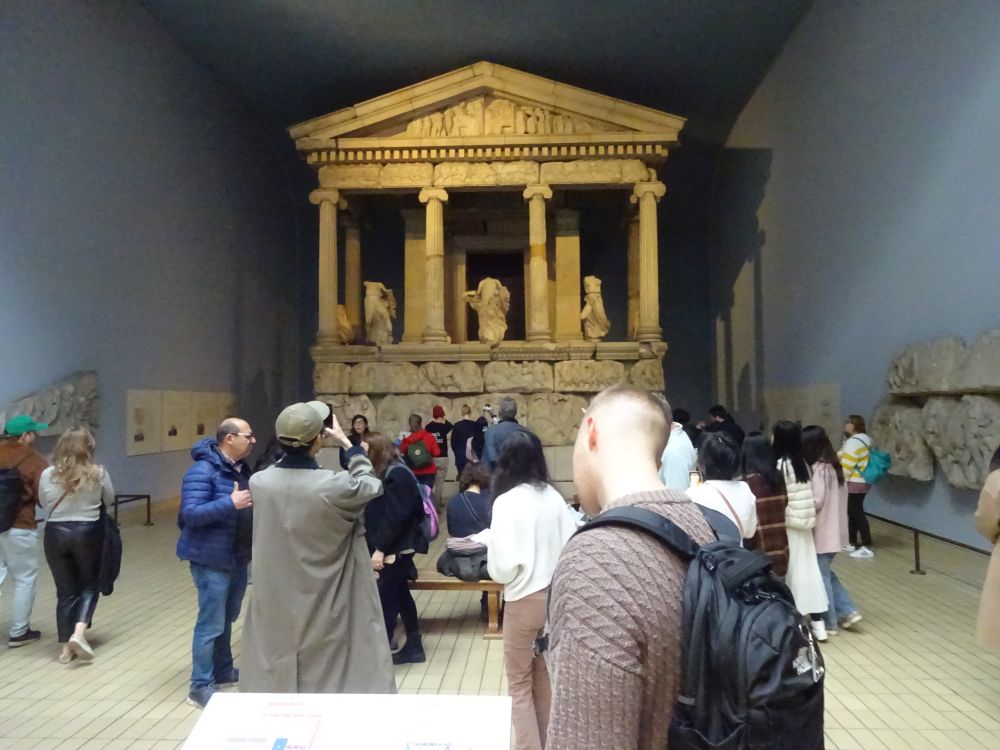 Then to the vast British Museum only a short walk from our hotel. We’ve been before, but last time Marie hadn’t had much time to look at the Rosetta Stone, which is their most popular exhibit. Sunny now, we waited in a short, fast-moving queue outside with the free tickets Marie reserved online.