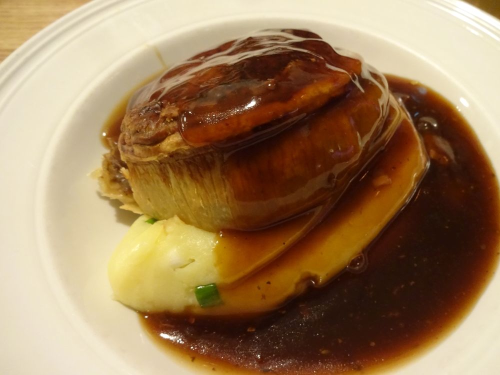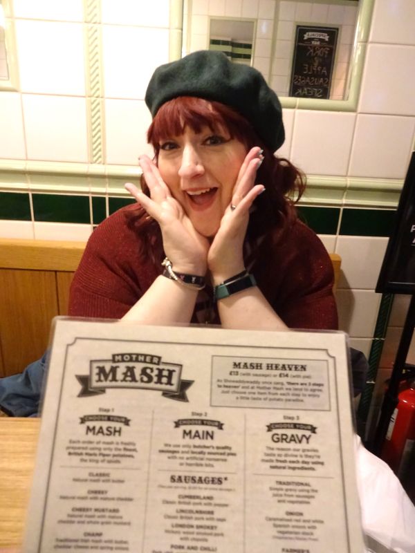 To be more detailed, Lincolnshire sausages with bubble ‘n’ squeak mash for Marie and a drink of fizzy dandelion & burdock, and for me a steak and stout pie with champ mash and washed down with a Cornish lager.