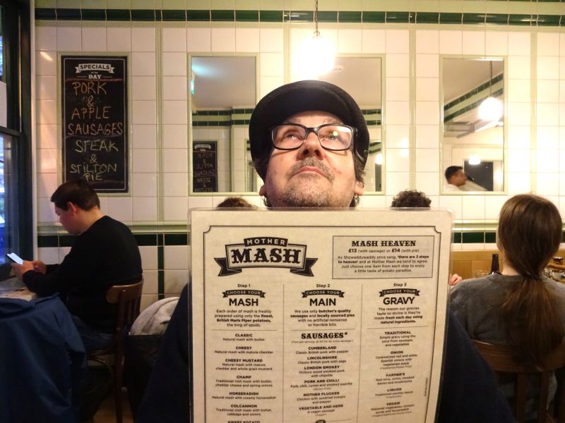 We shopped at Fopp, and bought a couple of British comedy-drama dvds and also wandered around Leicester Square and tourist areas. Then a bus back to Carnaby Street, we had a very hearty and satisfying pie-and-mash and bangers-and-mash meal each at Mother’s Mash! Absolute champion!