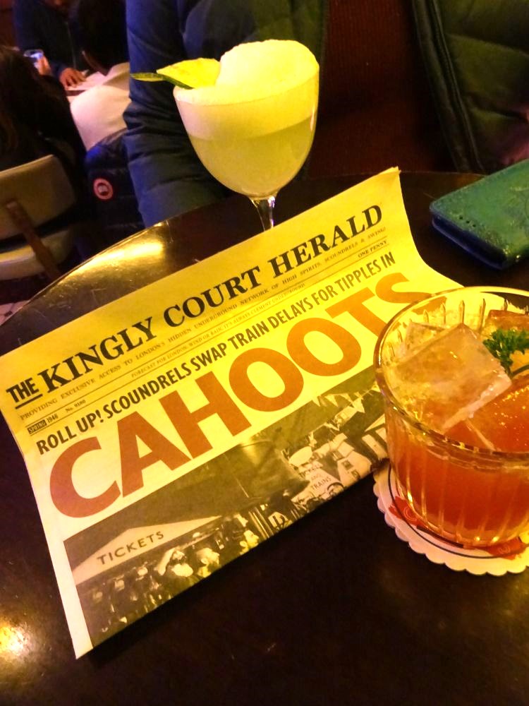 And then we went to a small, tiered square with shops and eateries to look for a cocktail bar recommended to us. Cahoots. Despite that it’s not a hidden speakeasy but is in plain sight, we almost gave up on finding it when we finally worked out where it was! They pretend not to let you in, and that they’re “full” for publicity reasons but never mind the slight frustration of that because we very much enjoyed it. It’s been converted from a disused old underground rail station, and is a partly 1940s war-time themed bar (I say partly because they did play some 1960s pop and rock). A lot of fun, and quite stylish, we had two cocktails each.