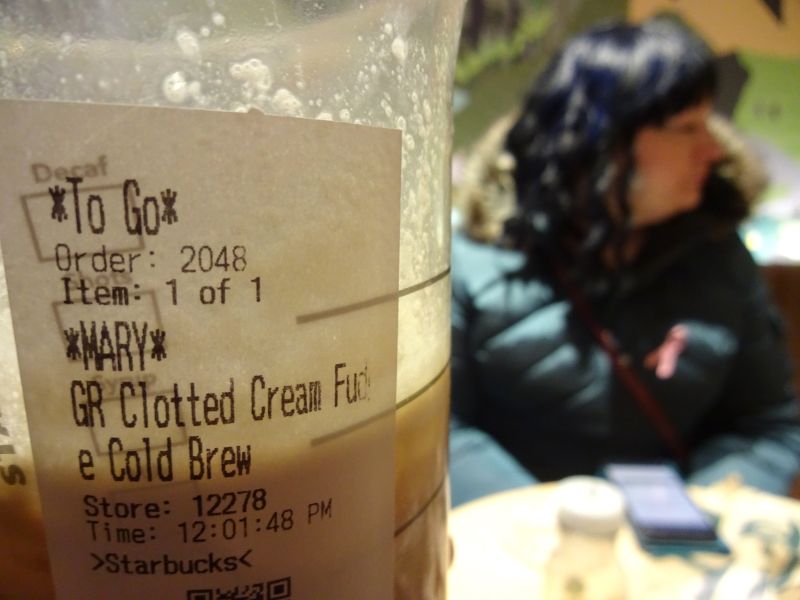 We got up a bit later, and had a coffee and a cheese & marmite panini at a Starbucks. Marie’s coffee was a clotted cream and fudge latte!