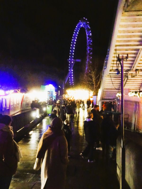 Back to the hotel in the evening and to our new hotel room which was compact with a high ceiling. Then back out. We had decided that the Christmas markets we would go to would be the ones on the South Bank opposite Westminster. They were open until late, unlike many. There were some good food options, but first off we had talked about possibly doing the London Eye. It was now just about sixty yards in front of us. The last ride was I believe 8pm and we just had time! Tickets are a lot – 42 GBP each – but because it was late couples and groups were getting their own pod each! It’s the size of a Manhattan studio apartment.