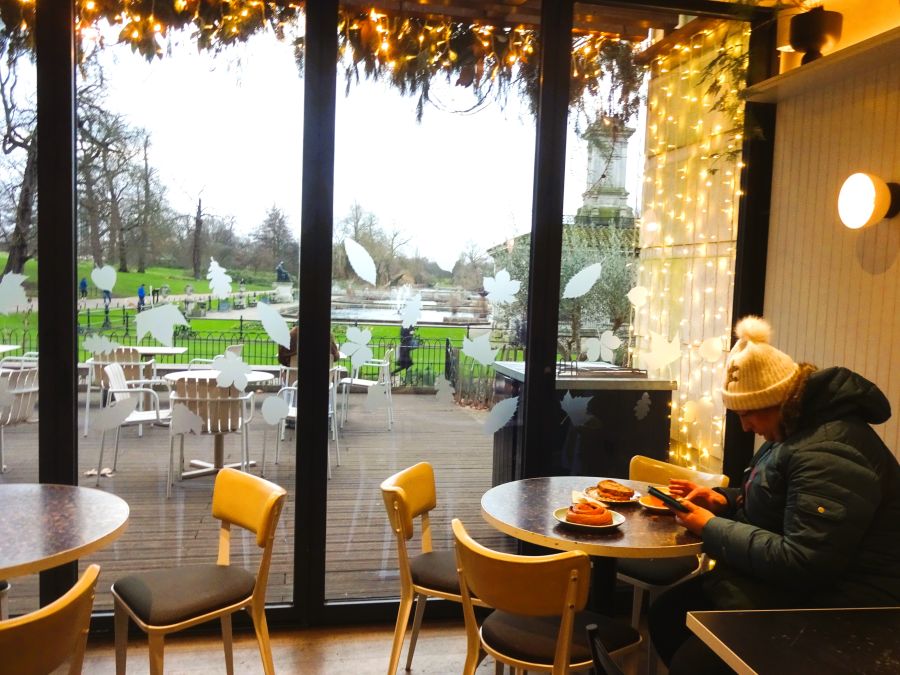 The morning was perfectly serene, and an enjoyable walk and the park was gorgeous. The cafe was simple inside but nice, with a fine deck with great views and more tables for a warmer time of year. Mind you, people were sat outside now – quite a few. There were dogwalkers galore, and ahead ponds and ornate fountains. We had a delicious ham and cheese toastie, a very butter-y pain au raisins and coffees.